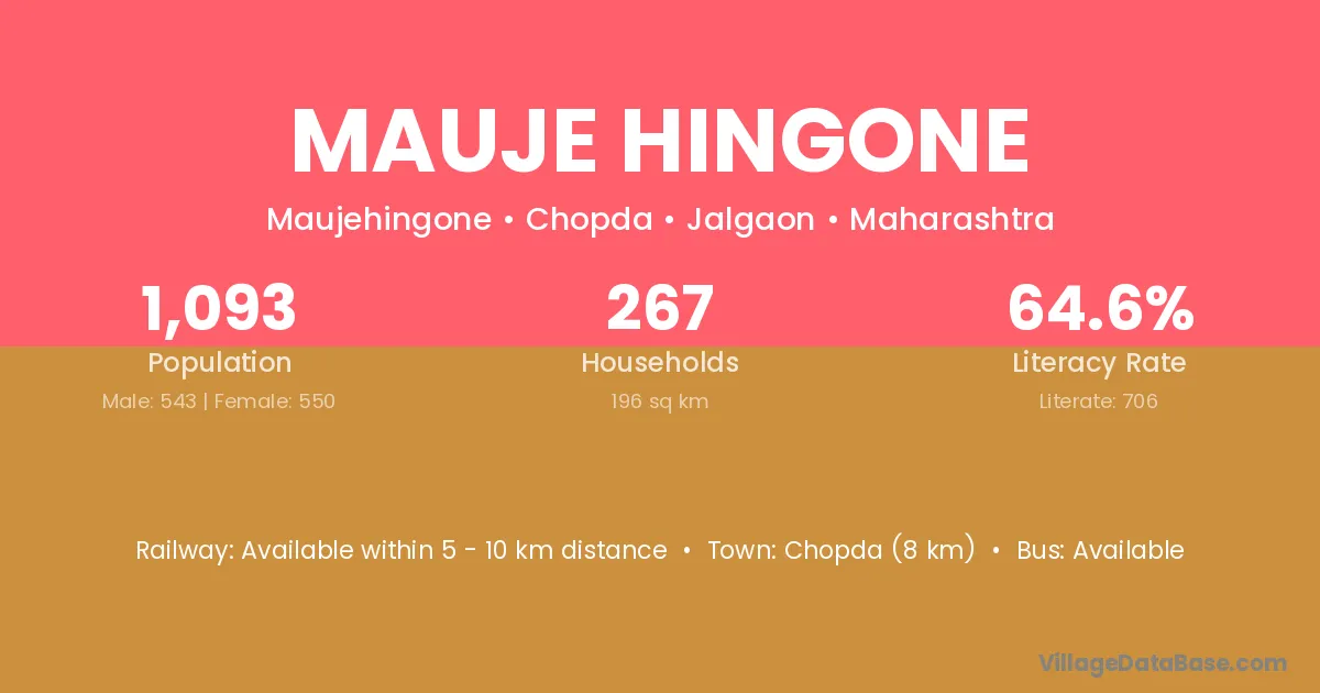 Chopda (8 km) is the nearest town to Mauje Hingone village for major economic activities and is located approximately 8 km away.