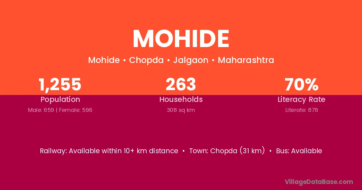 Chopda (31 km) is the nearest town to Mohide village for major economic activities and is located approximately 31 km away.