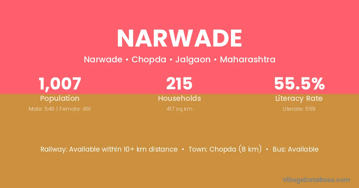 Chopda (8 km) is the nearest town to Narwade village for major economic activities and is located approximately 8 km away.