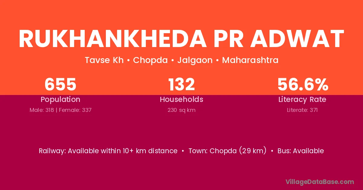 Rukhankheda Pr Adwat village has a total population of 655 people, of which 318 are males and 337 are females.