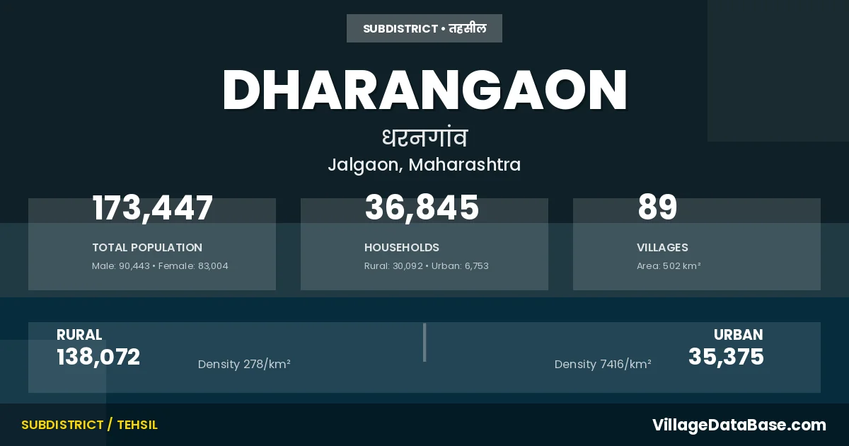According to the 2011 census The total area of Dharangaon Tehsil is 502 km², with a population of 173447 people. The population density is 346 inhabitants per square kilometre, and there are approximately 36845 houses in the sub district.