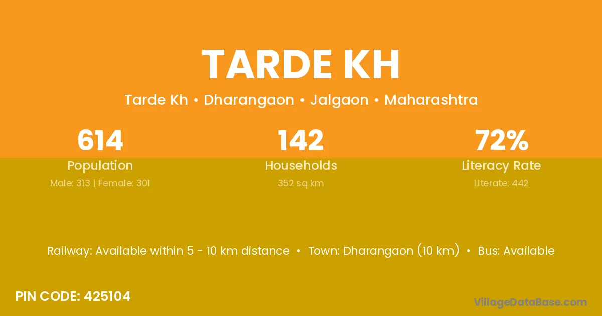 Dharangaon (10 km) is the nearest town to Tarde Kh village for major economic activities and is located approximately 10 km away.