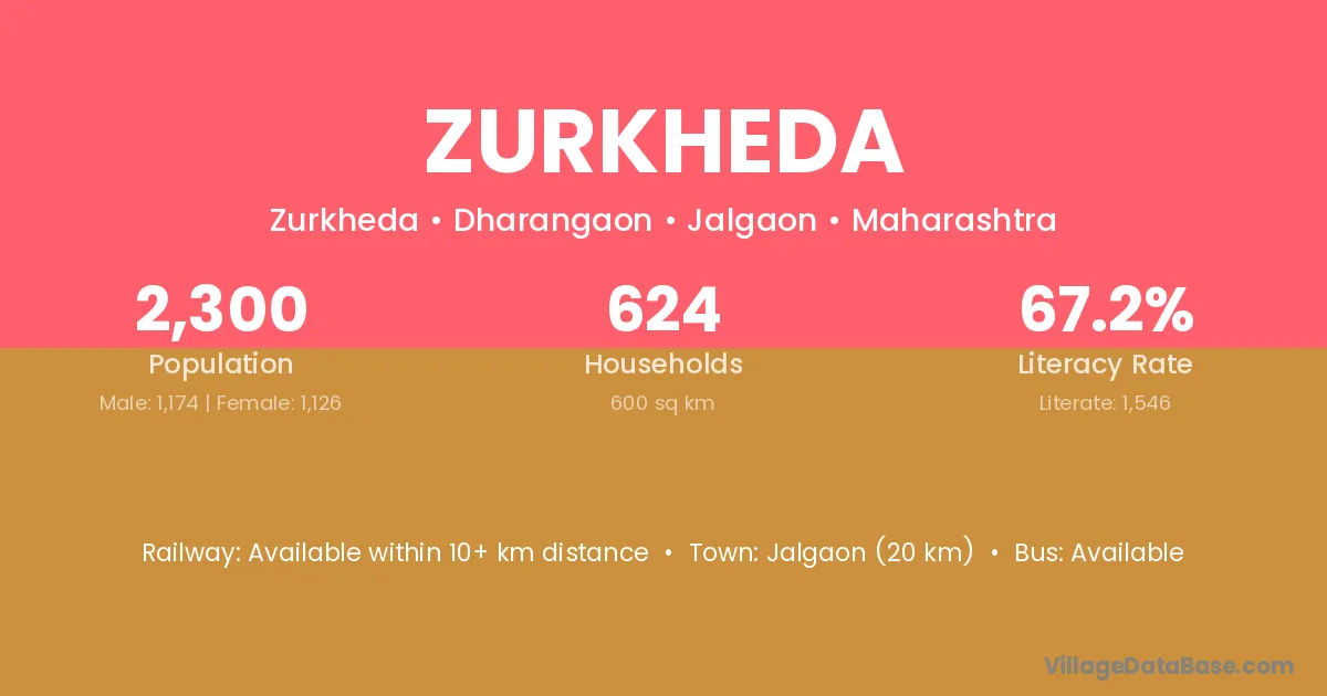 Jalgaon (20 km) is the nearest town to Zurkheda village for major economic activities and is located approximately 20 km away.