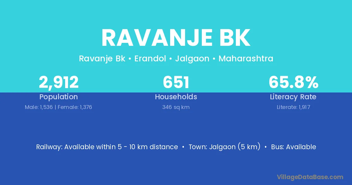 Jalgaon (5 km) is the nearest town to Ravanje Bk village for major economic activities and is located approximately 5 km away.