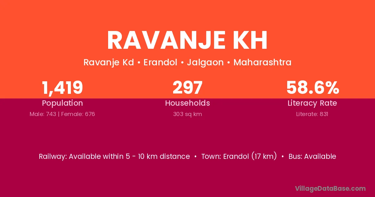 Erandol (17 km) is the nearest town to Ravanje Kh village for major economic activities and is located approximately 17 km away.