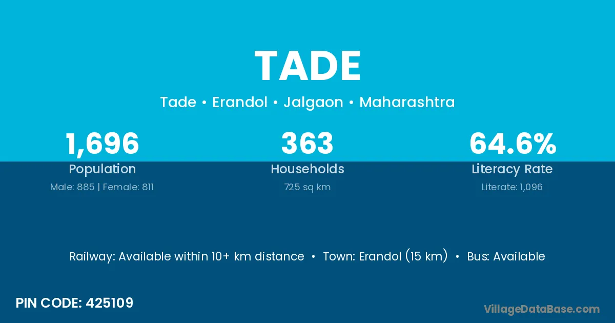 Erandol (15 km) is the nearest town to Tade village for major economic activities and is located approximately 15 km away.