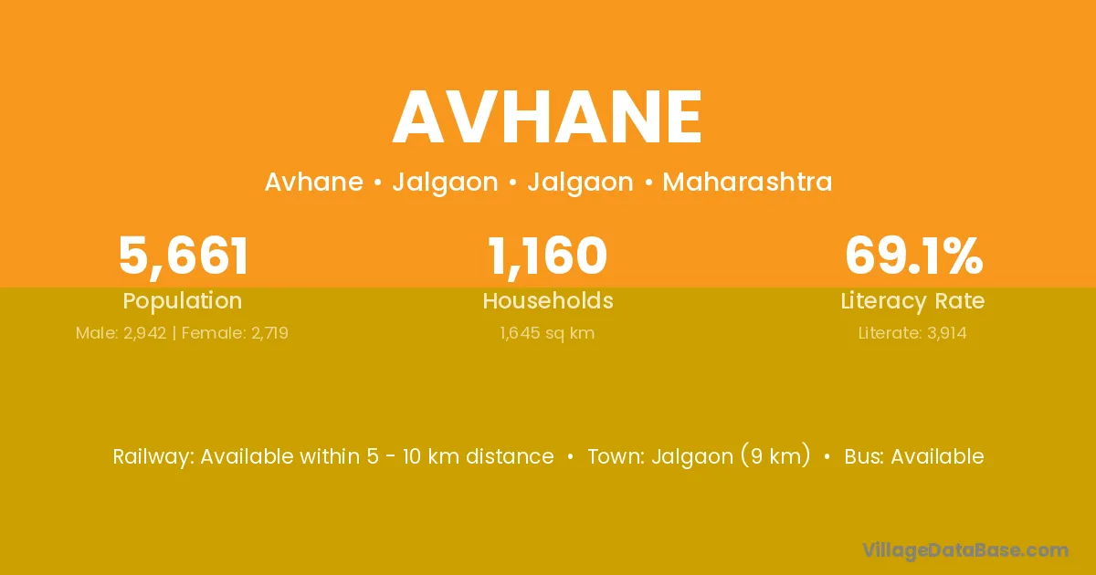 Jalgaon (9 km) is the nearest town to Avhane village for major economic activities and is located approximately 9 km away.