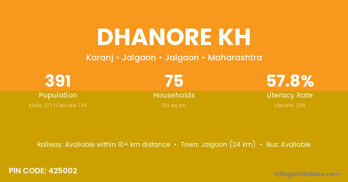 Jalgaon (24 km) is the nearest town to Dhanore Kh village for major economic activities and is located approximately 24 km away.