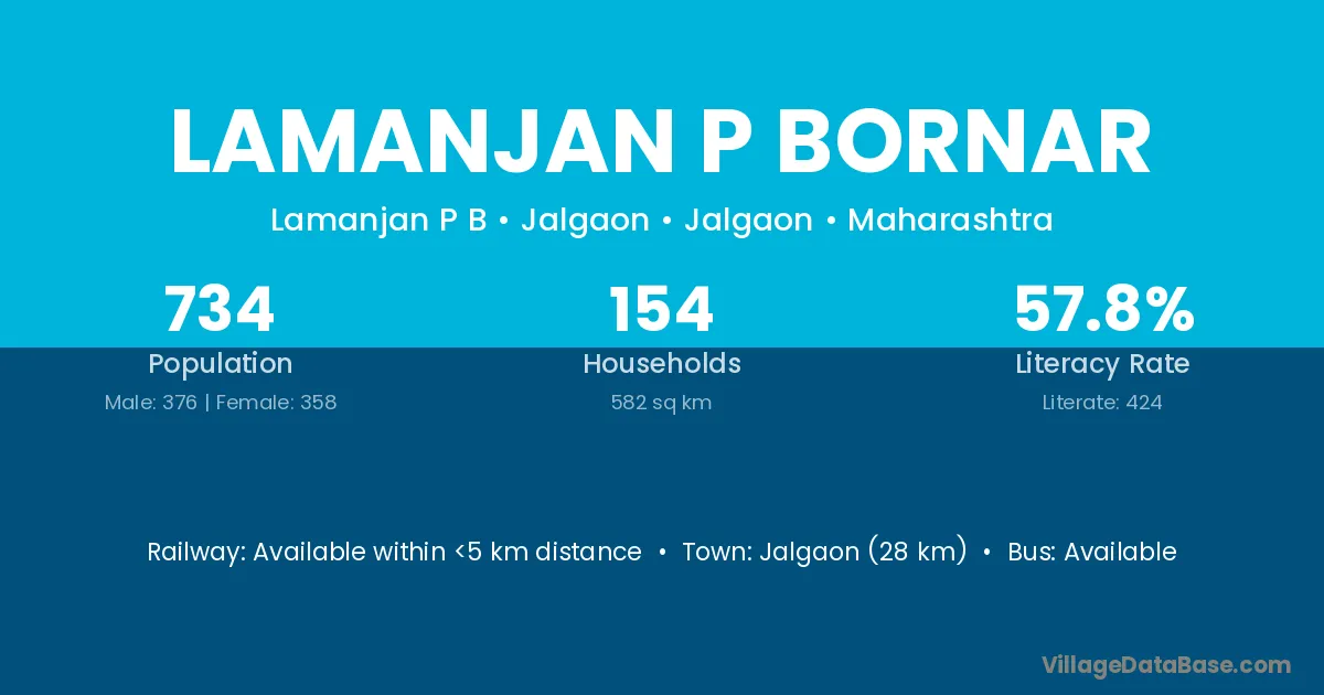 Jalgaon (28 km) is the nearest town to Lamanjan P Bornar village for major economic activities and is located approximately 28 km away.