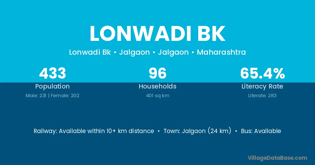 Jalgaon (24 km) is the nearest town to Lonwadi Bk village for major economic activities and is located approximately 24 km away.