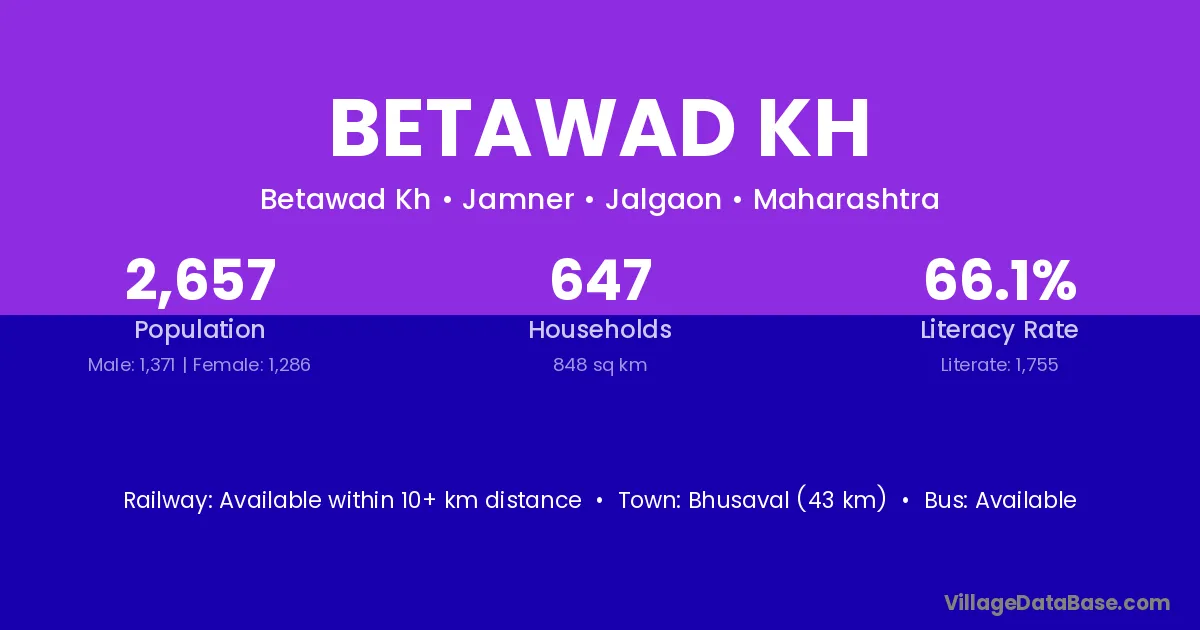 Bhusaval (43 km) is the nearest town to Betawad Kh village for major economic activities and is located approximately 43 km away.
