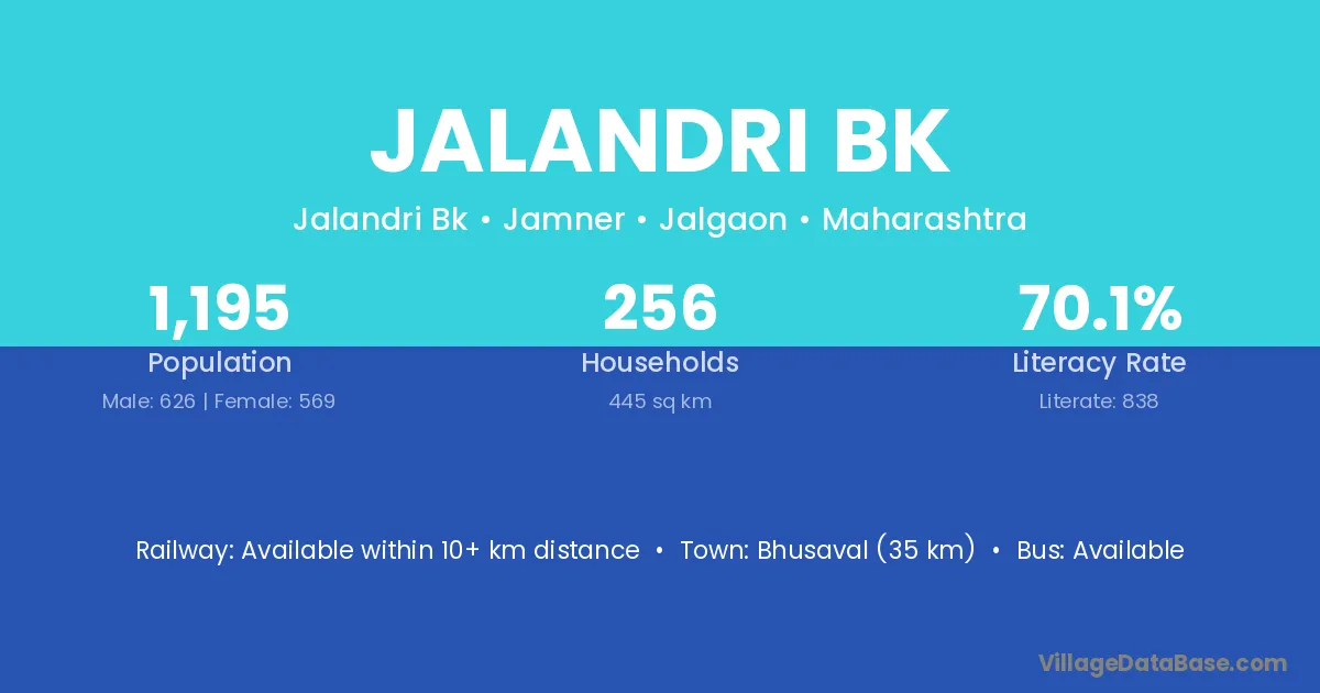 Bhusaval (35 km) is the nearest town to Jalandri Bk village for major economic activities and is located approximately 35 km away.