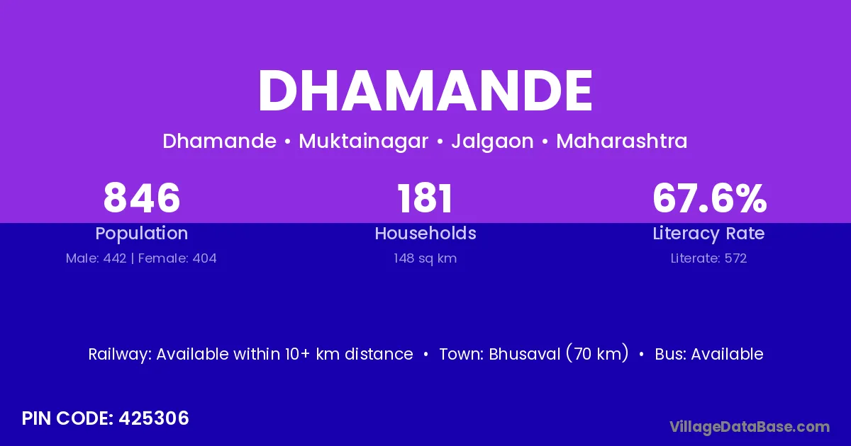Bhusaval (70 km) is the nearest town to Dhamande village for major economic activities and is located approximately 70 km away.