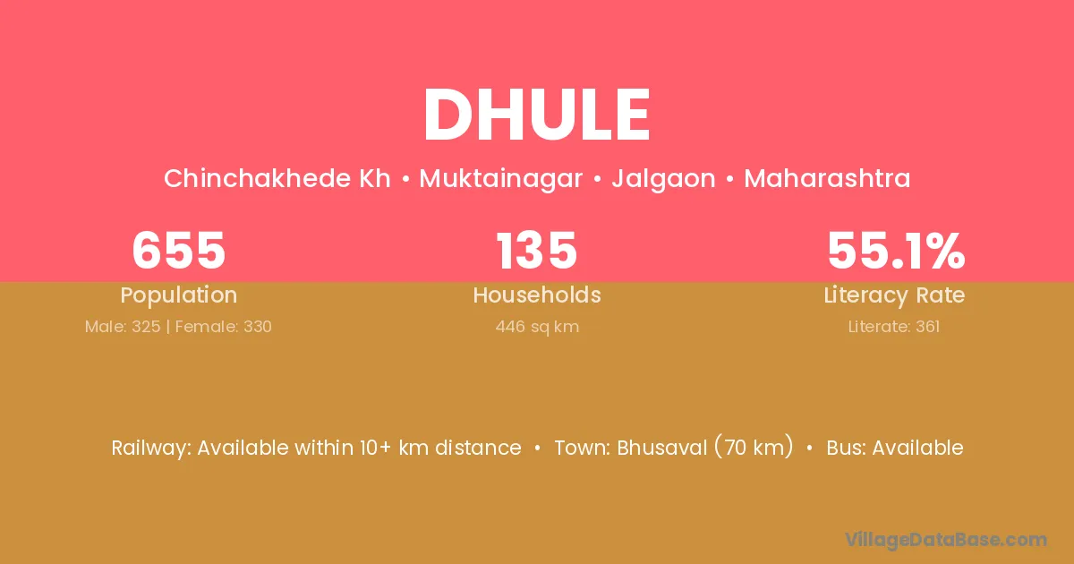 Dhule village has a total population of 655 people, of which 325 are males and 330 are females.