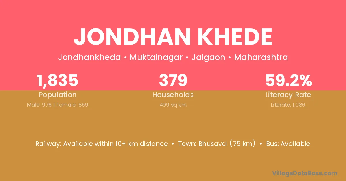 Bhusaval (75 km) is the nearest town to Jondhan Khede village for major economic activities and is located approximately 75 km away.
