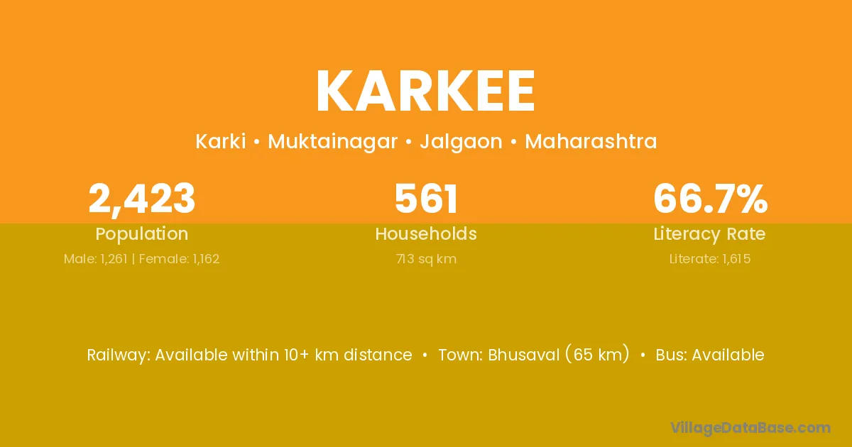 Bhusaval (65 km) is the nearest town to Karkee village for major economic activities and is located approximately 65 km away.