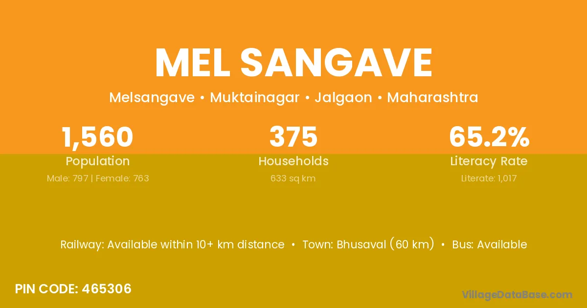 Bhusaval (60 km) is the nearest town to Mel Sangave village for major economic activities and is located approximately 60 km away.