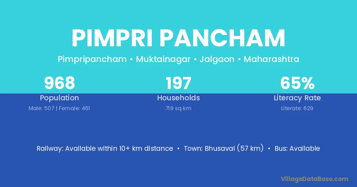 Bhusaval (57 km) is the nearest town to Pimpri Pancham village for major economic activities and is located approximately 57 km away.