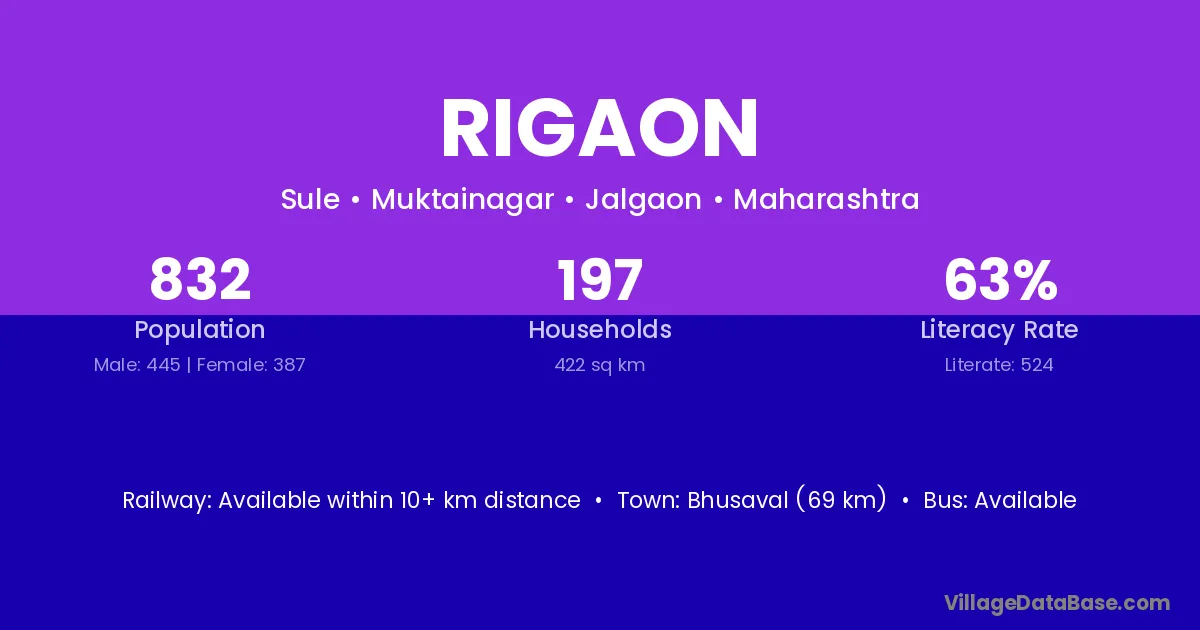 Bhusaval (69 km) is the nearest town to Rigaon village for major economic activities and is located approximately 69 km away.