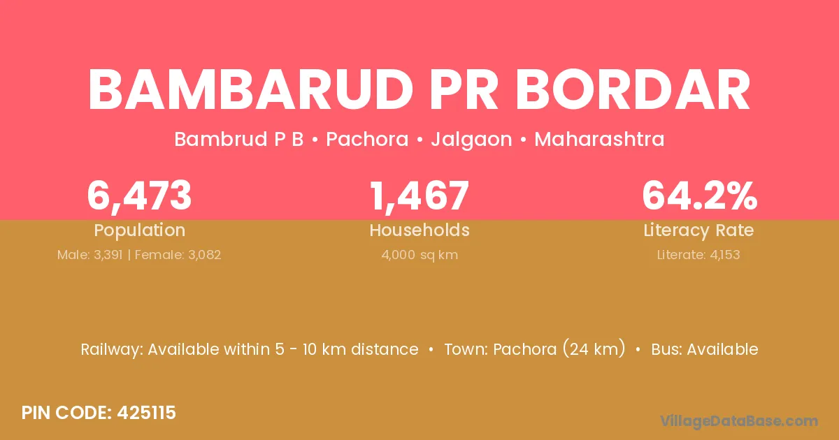 Bambarud Pr Bordar village has a total population of 6,473 people, of which 3,391 are males and 3,082 are females.