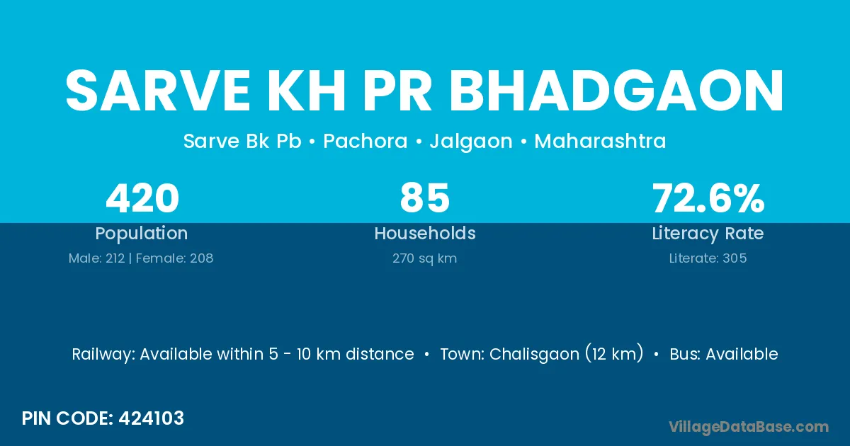 Sarve Kh Pr Bhadgaon village has a total population of 420 people, of which 212 are males and 208 are females.