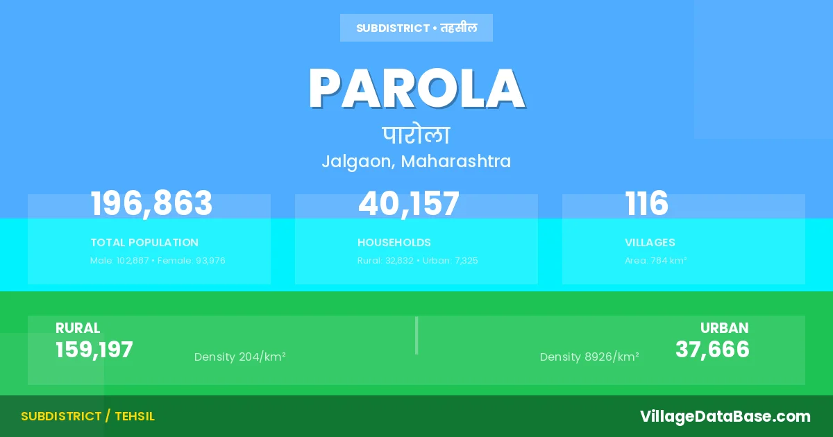 According to the 2011 census The total area of Parola Tehsil is 784 km², with a population of 196863 people. The population density is 251 inhabitants per square kilometre, and there are approximately 40157 houses in the sub district.