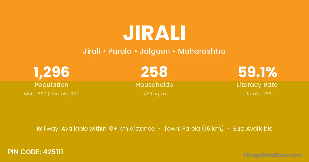 Parola (16 km) is the nearest town to Jirali village for major economic activities and is located approximately 16 km away.