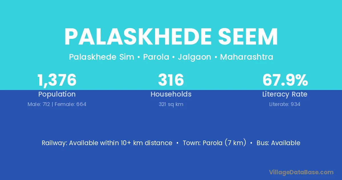 Parola (7 km) is the nearest town to Palaskhede Seem village for major economic activities and is located approximately 7 km away.