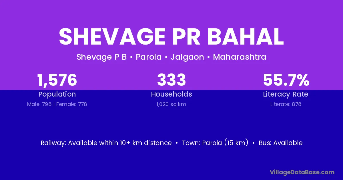 Parola (15 km) is the nearest town to Shevage Pr Bahal village for major economic activities and is located approximately 15 km away.