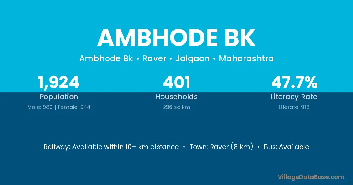 Ambhode Bk village has a total population of 1,924 people, of which 980 are males and 944 are females.