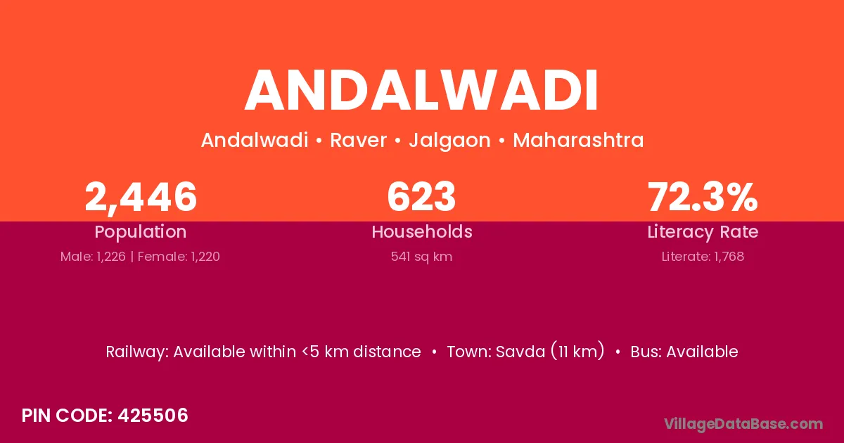 Andalwadi village has a total population of 2,446 people, of which 1,226 are males and 1,220 are females.