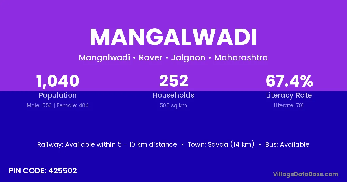 Savda (14 km) is the nearest town to Mangalwadi village for major economic activities and is located approximately 14 km away.