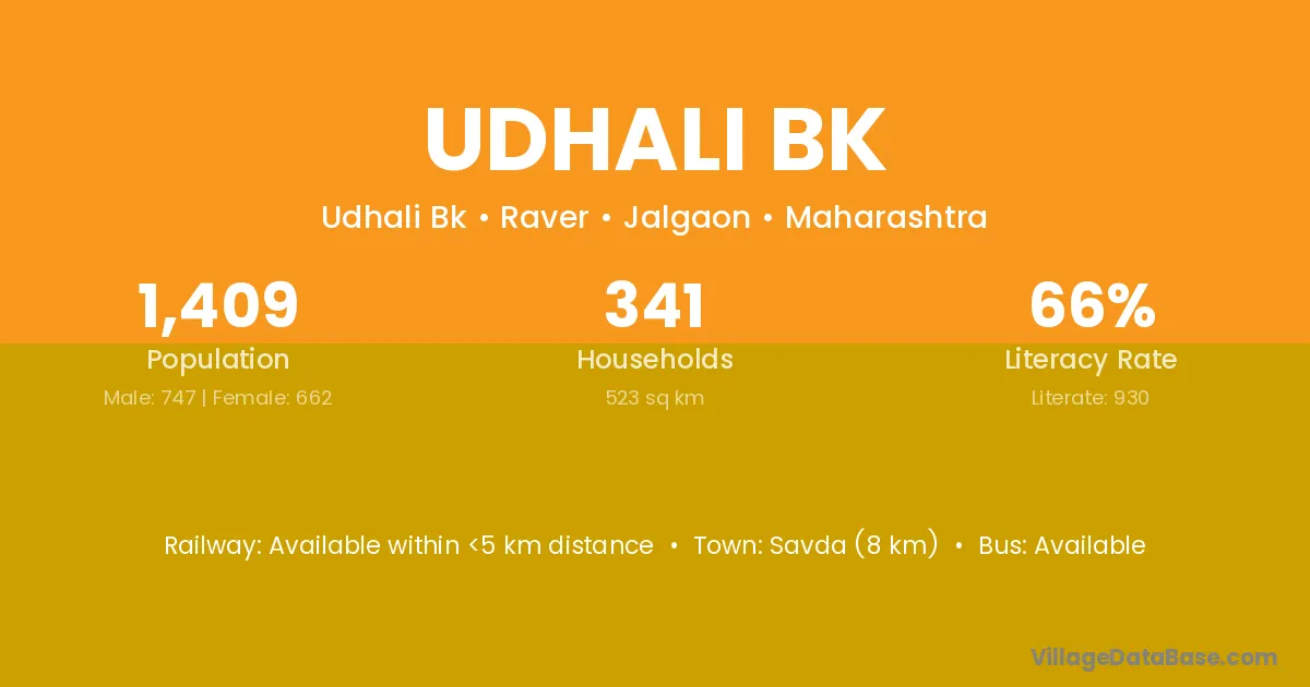 Savda (8 km) is the nearest town to Udhali Bk village for major economic activities and is located approximately 8 km away.