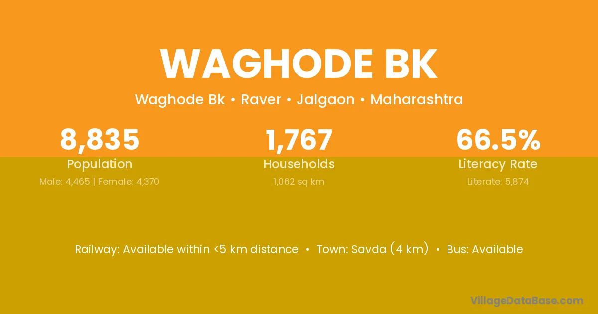 Waghode Bk village has a total population of 8,835 people, of which 4,465 are males and 4,370 are females.