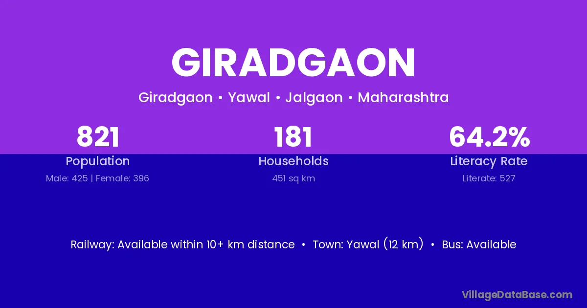 Yawal (12 km) is the nearest town to Giradgaon village for major economic activities and is located approximately 12 km away.