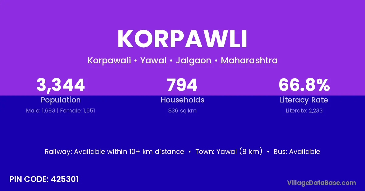 Yawal (8 km) is the nearest town to Korpawli village for major economic activities and is located approximately 8 km away.