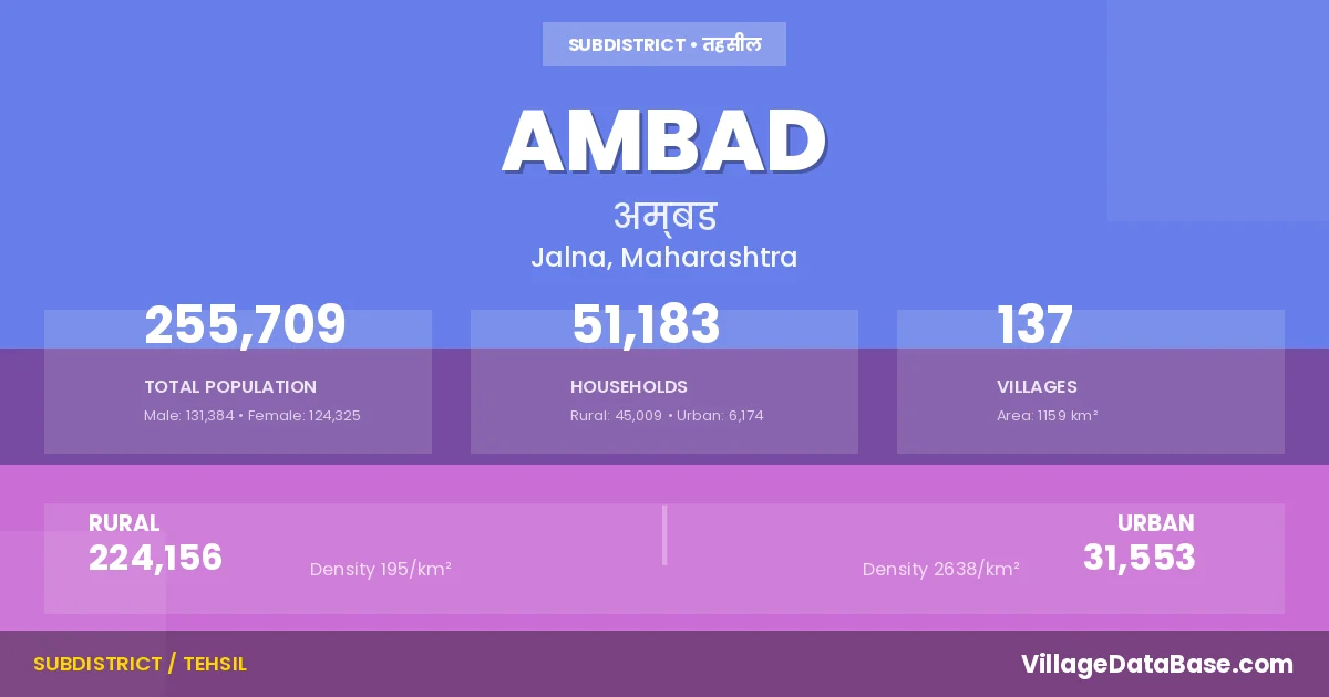 According to the 2011 census The total area of Ambad Tehsil is 1159 km², with a population of 255709 people. The population density is 221 inhabitants per square kilometre, and there are approximately 51183 houses in the sub district.