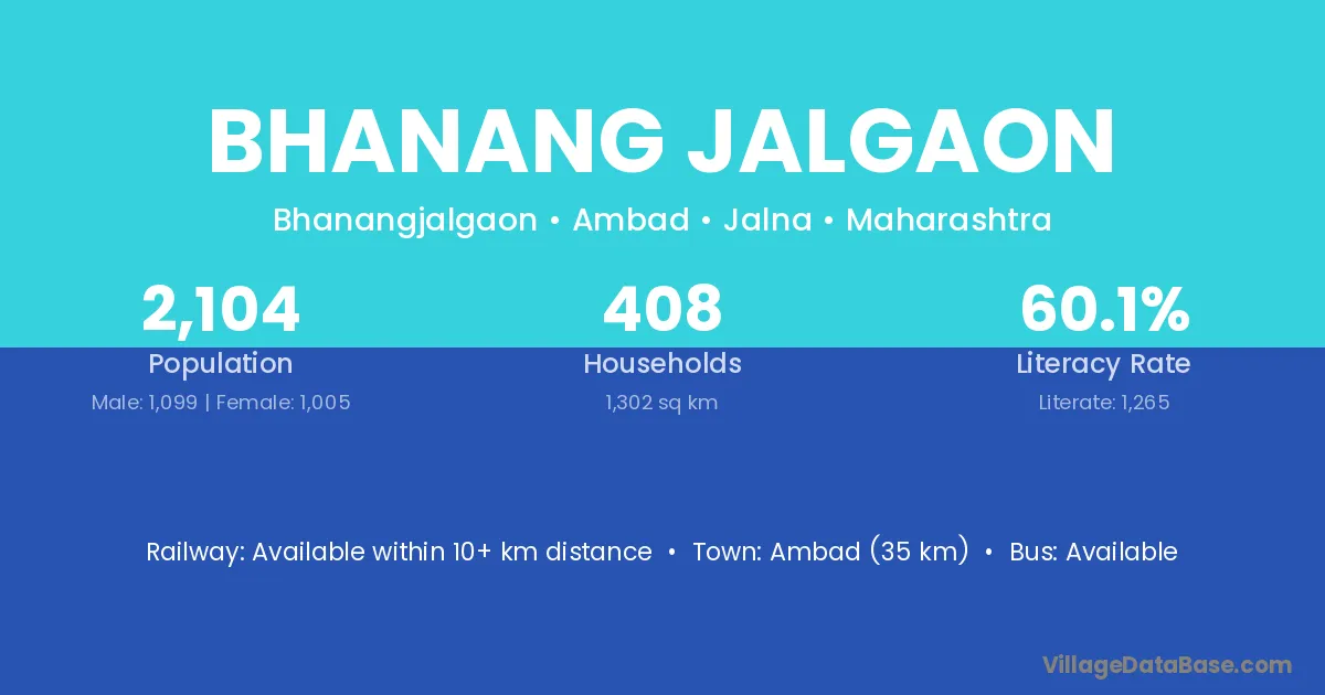Bhanang Jalgaon village has a total population of 2,104 people, of which 1,099 are males and 1,005 are females.