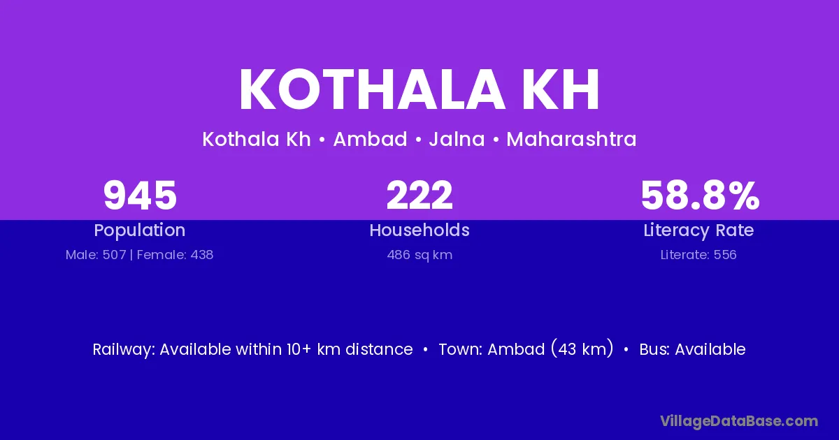 Ambad (43 km) is the nearest town to Kothala Kh village for major economic activities and is located approximately 43 km away.