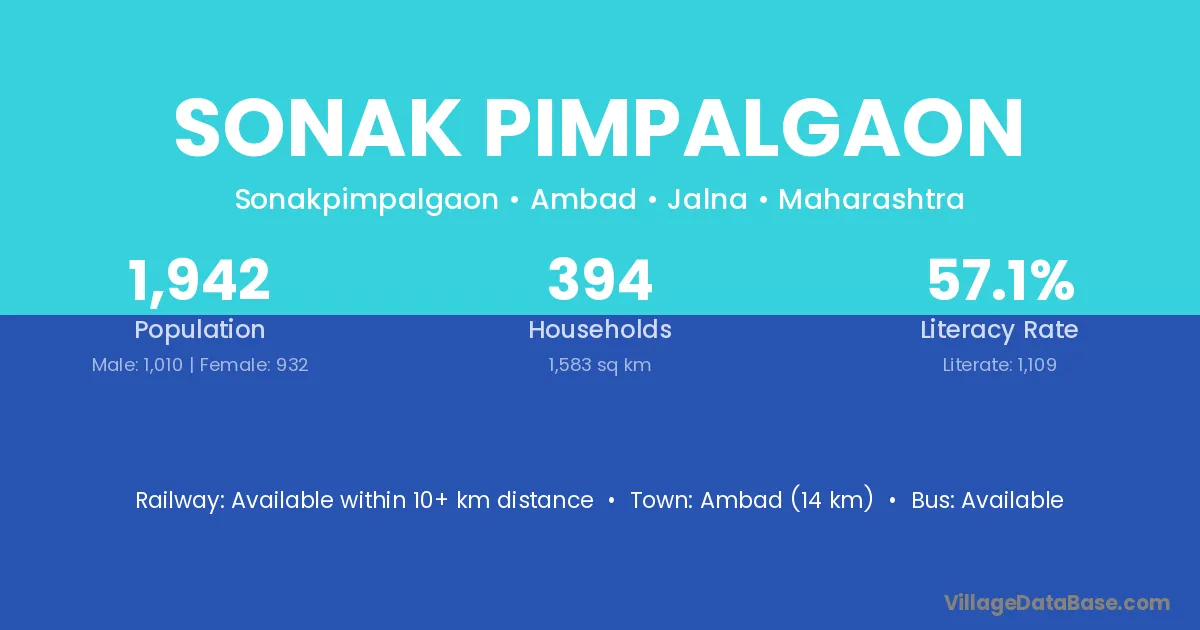 Ambad (14 km) is the nearest town to Sonak Pimpalgaon village for major economic activities and is located approximately 14 km away.