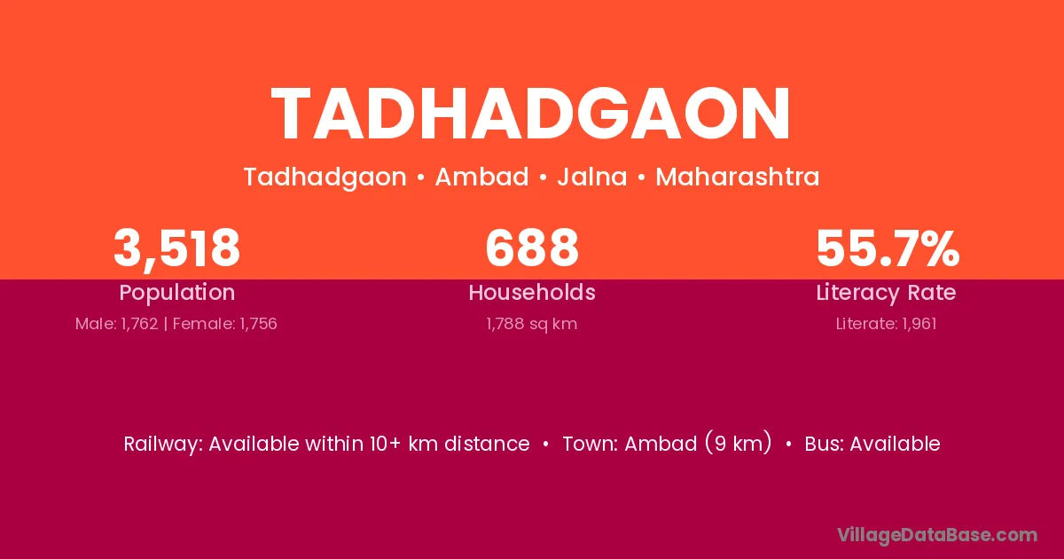 Tadhadgaon village has a total population of 3,518 people, of which 1,762 are males and 1,756 are females.