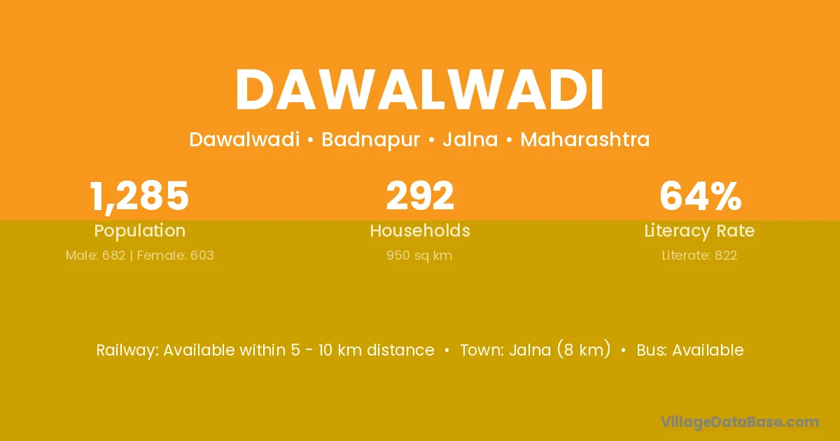 Dawalwadi village has a total population of 1,285 people, of which 682 are males and 603 are females.