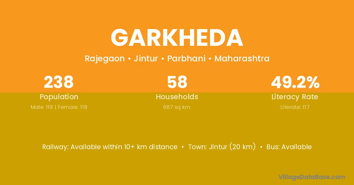 Bhokardan (8 km) is the nearest town to Garkheda village for major economic activities and is located approximately 8 km away.