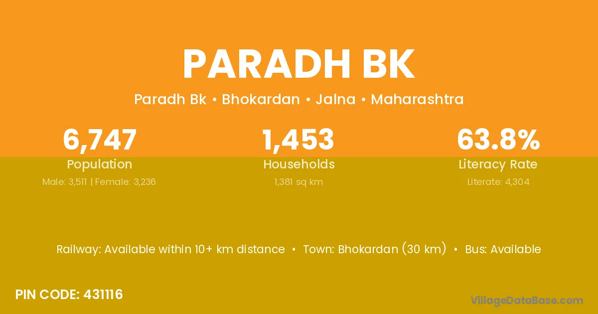 Bhokardan (30 km) is the nearest town to Paradh Bk village for major economic activities and is located approximately 30 km away.