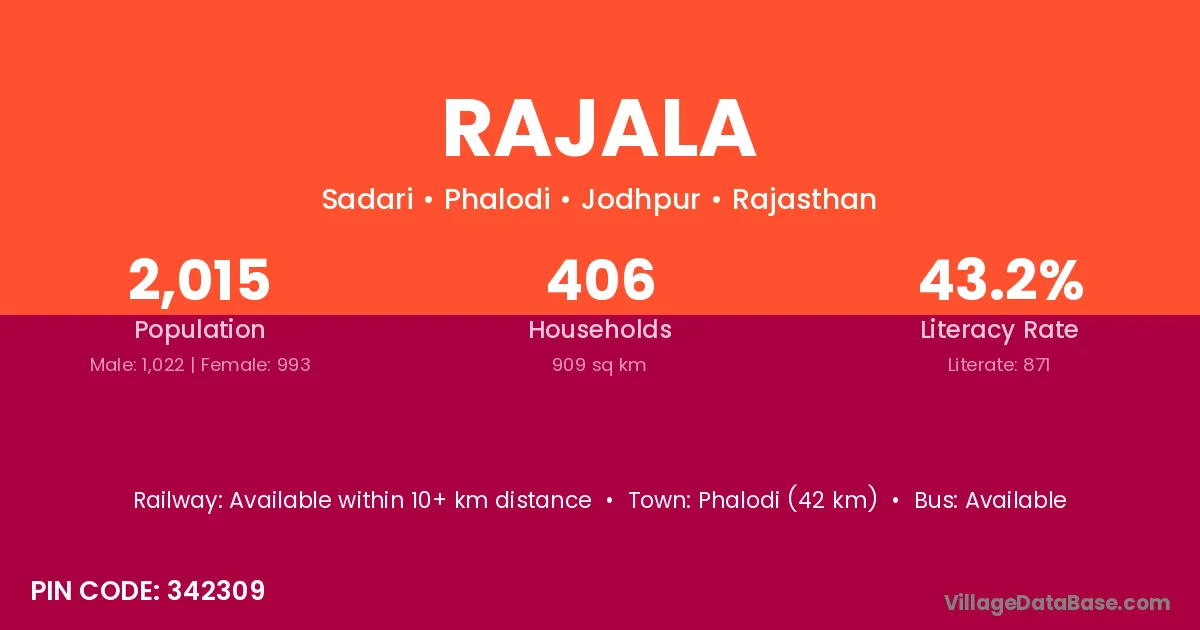 The literacy rate of Rajala village is 51.89%. Male literacy stands at 61.42% and female literacy at 41.94%.