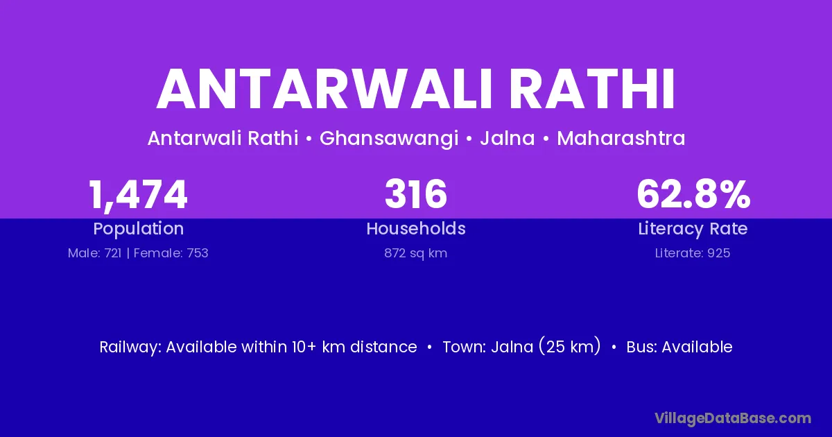 Jalna (25 km) is the nearest town to Antarwali Rathi village for major economic activities and is located approximately 25 km away.