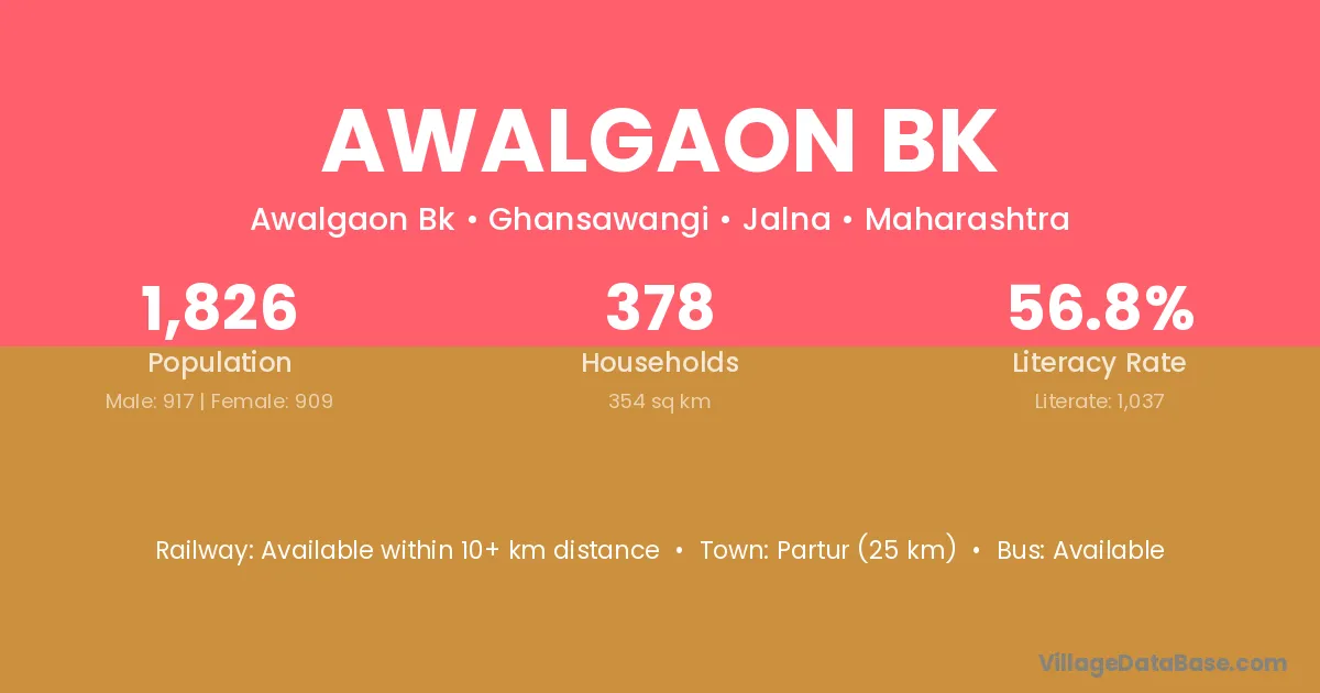 Awalgaon Bk village has a total population of 1,826 people, of which 917 are males and 909 are females.