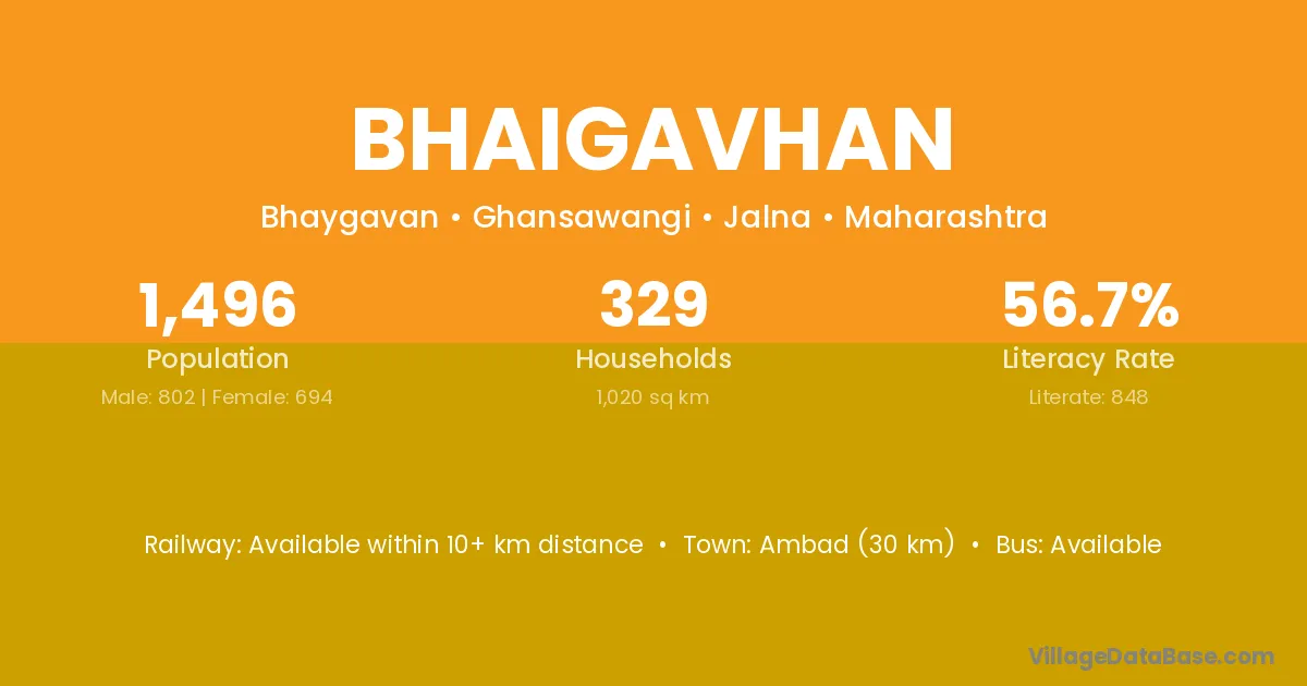 Bhaigavhan village has a total population of 1,496 people, of which 802 are males and 694 are females.