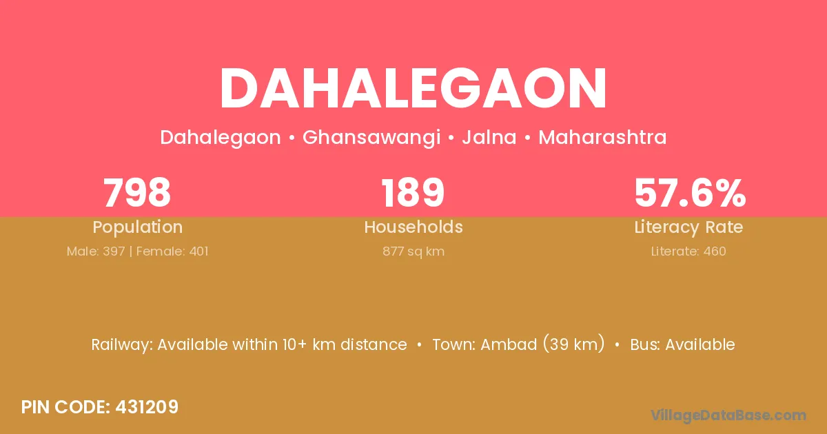 Ambad (39 km) is the nearest town to Dahalegaon village for major economic activities and is located approximately 39 km away.