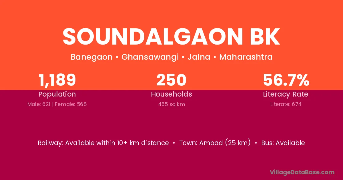 Soundalgaon Bk village has a total population of 1,189 people, of which 621 are males and 568 are females.